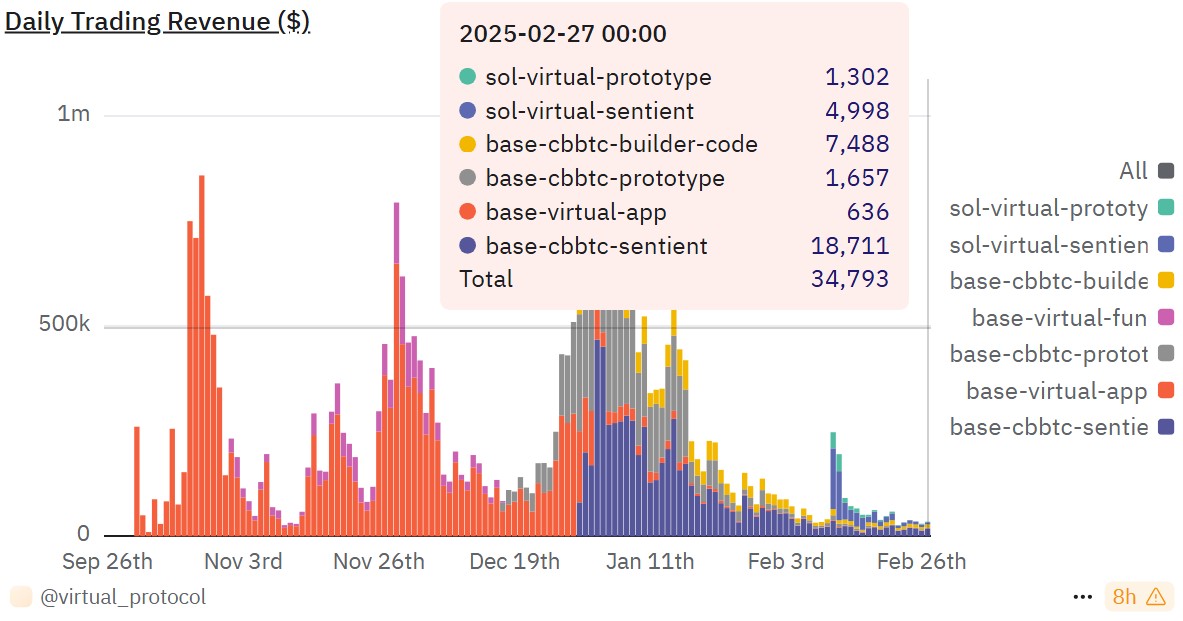 Revenue from the Base virtual app has been particularly weak, with earnings remaining below $1,000 for 10 consecutive days, declining from its daily peak of $859,000 on Oct. 27, 2024. In total, Virtuals generated $28,492 on the Base network and $6,300 on Solana on Feb. 27.