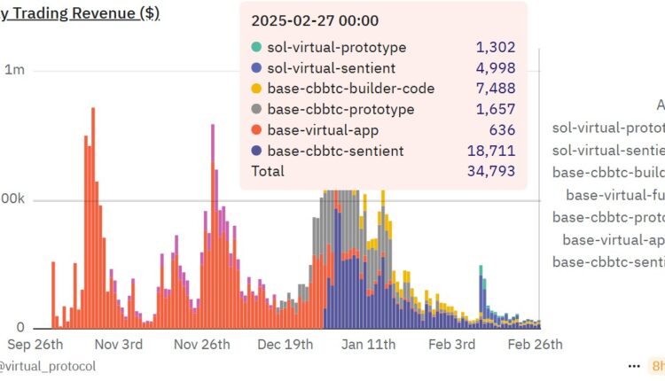 Revenue from the Base virtual app has been particularly weak, with earnings remaining below $1,000 for 10 consecutive days, declining from its daily peak of $859,000 on Oct. 27, 2024. In total, Virtuals generated $28,492 on the Base network and $6,300 on Solana on Feb. 27.