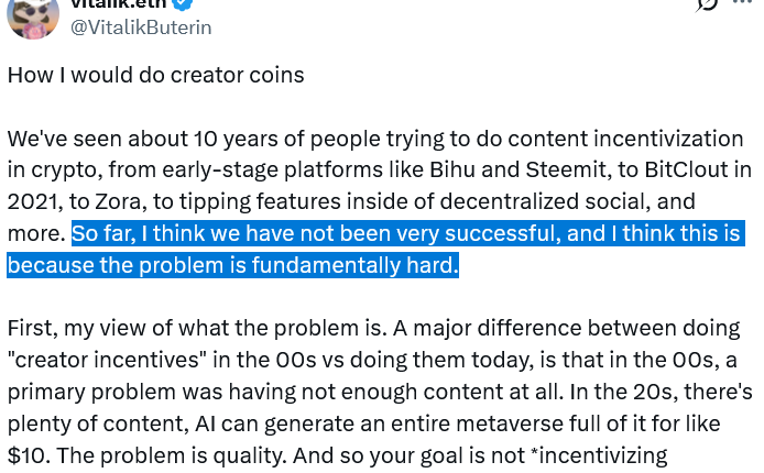 However, in a post on X on Sunday, Buterin said existing creator token platforms notably prioritize mass content creation over quality, and it’s now being exacerbated by AI-generated content.