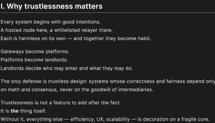 The Trustless Manifesto, also authored by Ethereum Foundation researchers Yoav Weiss and Marissa Posner, said crypto platforms sacrifice trustlessness from the first moment that they integrate a hosted node or centralized relayer — explaining that while it feels harmless, it becomes a habit, and with each passing checkpoint, the protocol becomes less and less permissionless.