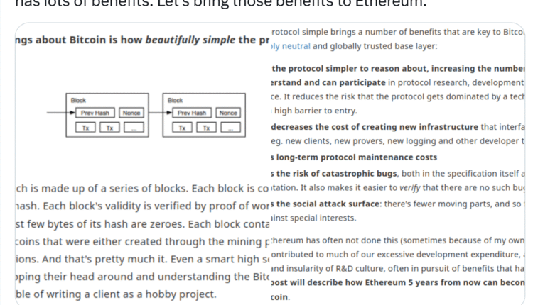 “This post will describe how Ethereum 5 years from now can become close to as simple as Bitcoin,” Buterin wrote, arguing that simplicity is key to Ethereum’s resilience and long-term scalability.