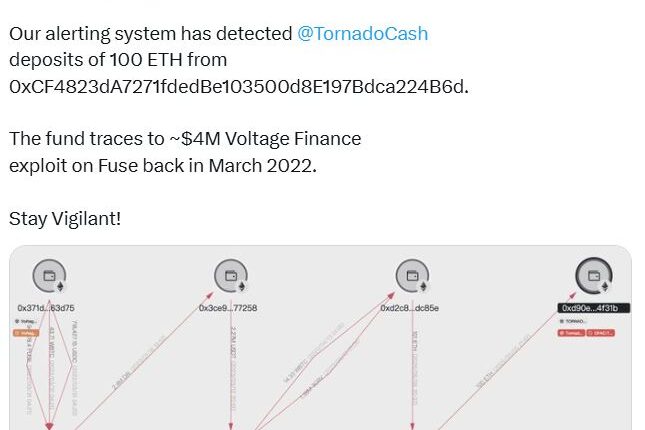 A hacker involved in the $4.67 million exploit of the decentralized finance lending protocol Voltage Finance in 2022 has moved some of the stolen Ether to Tornado Cash after a short hibernation.