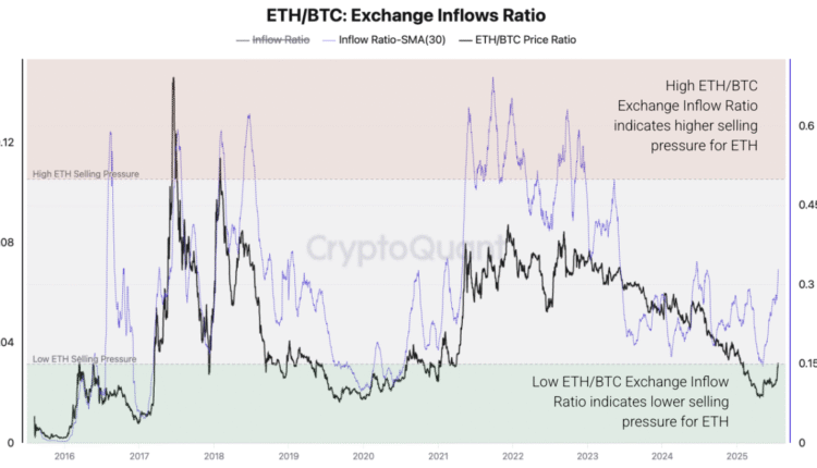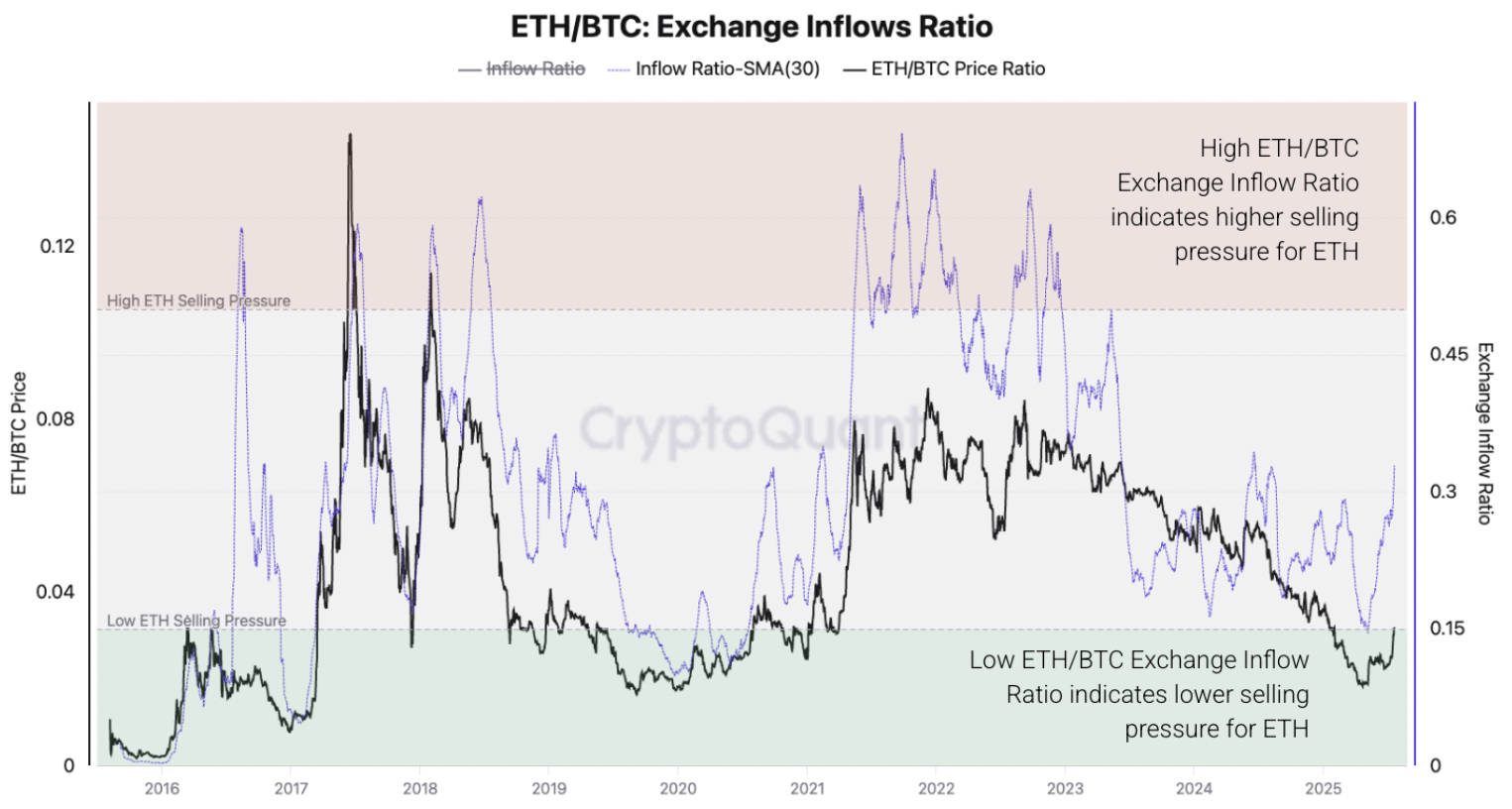 “Lower ETH/BTC exchange inflow ratio indicates lower selling pressure for ETH,” CryptoQuant wrote, adding: