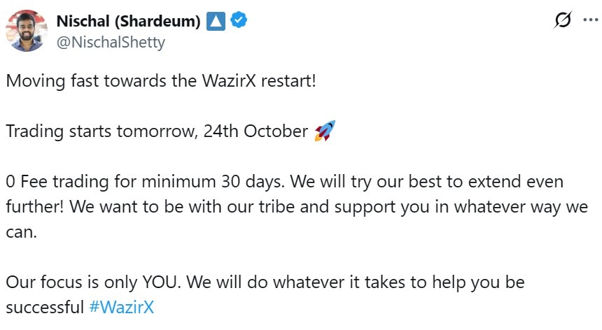 WazirX CEO Nischal Shetty said in a Thursday announcement that the company will relaunch trading Friday, offering zero trading fees for at least 30 days as part of a phased reboot.