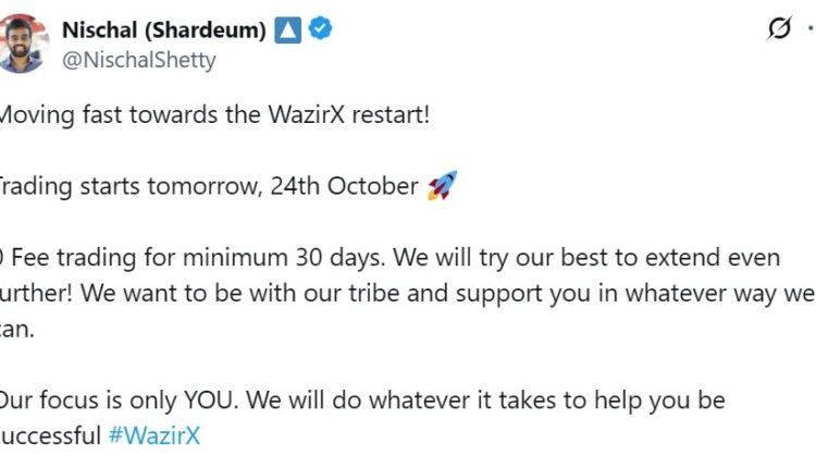 WazirX CEO Nischal Shetty said in a Thursday announcement that the company will relaunch trading Friday, offering zero trading fees for at least 30 days as part of a phased reboot.
