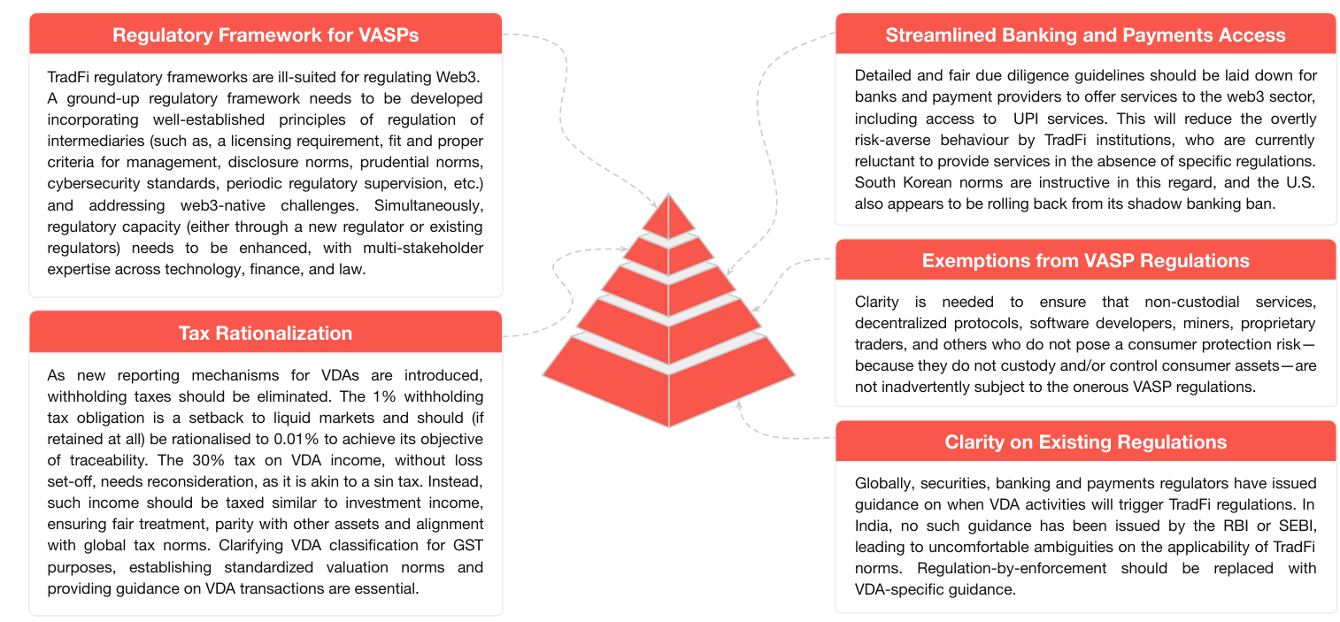 The policy wish list for the Indian Web3 includes the regulatory framework for virtual asset service providers (VASP), tax rationalization, streamlined banking and payment access for Web3 companies, exemptions from VASP regulations and clarity on existing regulations.