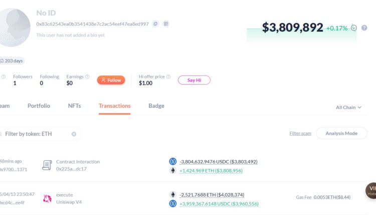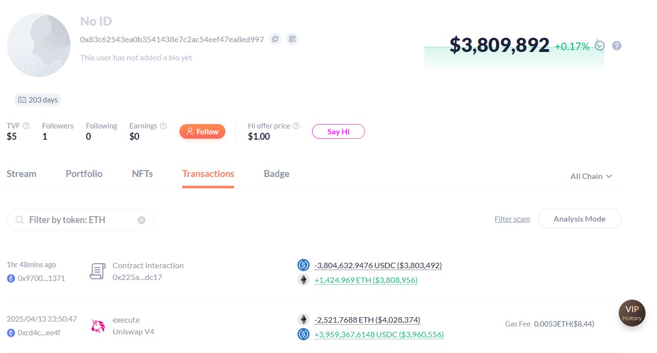 On April 13, the same wallet sold 2,522 ETH for $3.9 million, when the asset was trading at about $1,570, a decision that, in retrospect, looks poorly-timed.