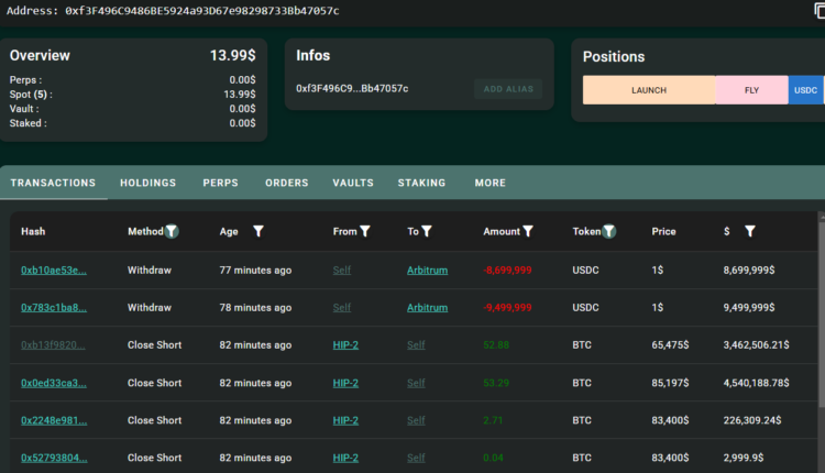 The savvy whale closed all his short positions within a few hours, making a $9.46 million profit from Bitcoin’s decline, Hypurrscan data shows.