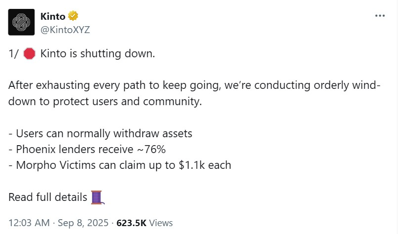 Kinto said worsening market conditions have forced the project to shut down. The protocol said they’ve operated without salaries since July, and since it couldn’t go through with its last financing attempt, they’ve made the decision to shut down.