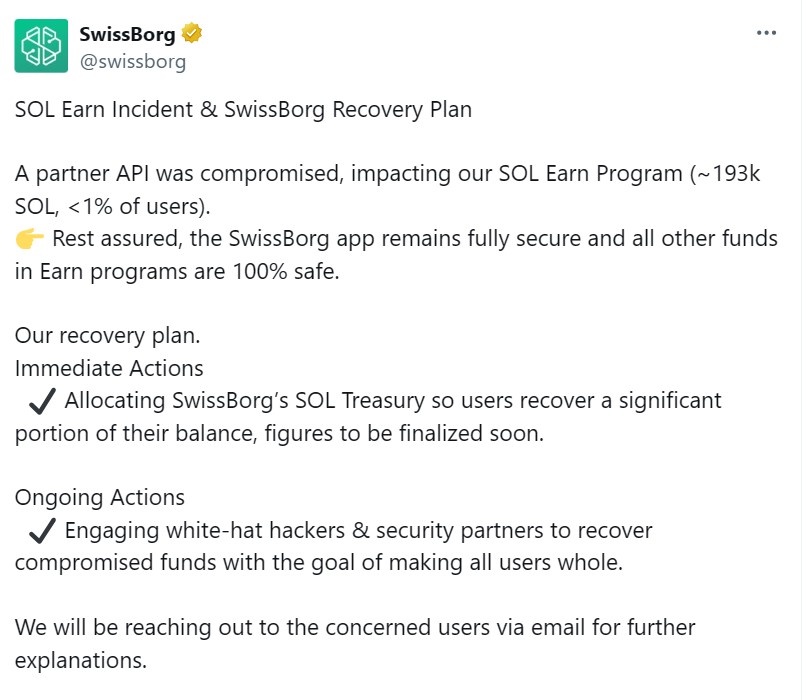 SwissBorg hacked for $41 million SOL after third-party API compromise