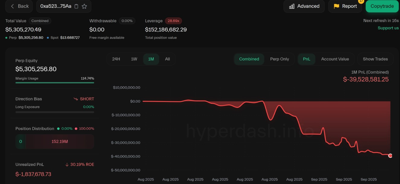 An unknown Hyperliquid trader has surpassed James Wynn, becoming the trading platform’s biggest losing whale, with more than $40 million in losses within a month, according to blockchain data.