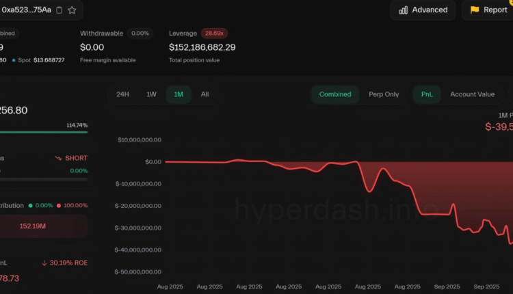An unknown Hyperliquid trader has surpassed James Wynn, becoming the trading platform’s biggest losing whale, with more than $40 million in losses within a month, according to blockchain data.