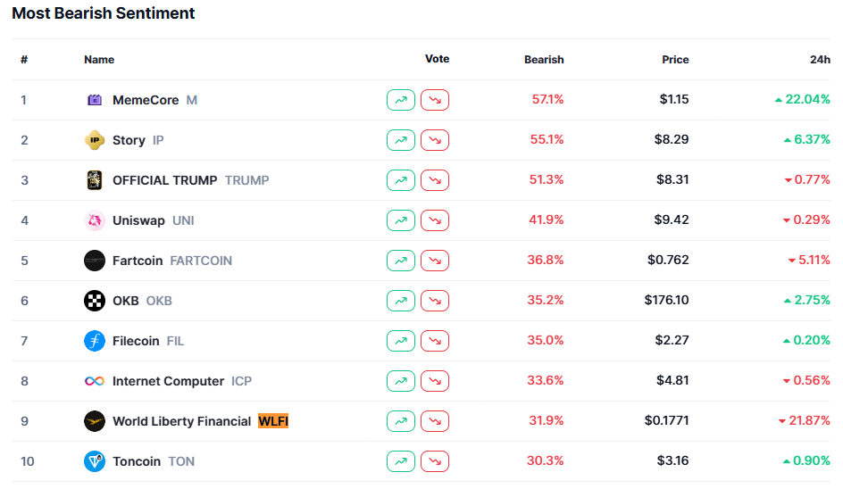 The WLFI token is currently the ninth-most-bearish token among the 100 largest cryptocurrencies by investor sentiment, with 31.9% of its users bearish about the token’s prospects, CoinMarketCap data shows.