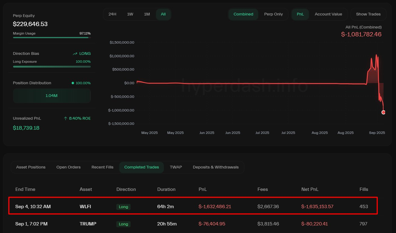 Whale wallet 0x432 lost more than $1.6 million after closing a 3x leveraged WLFI long position, according to Onchain Lens.