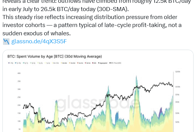 “This steady rise reflects increasing distribution pressure from older investor cohorts — a pattern typical of late-cycle profit-taking, not a sudden exodus of whales.”