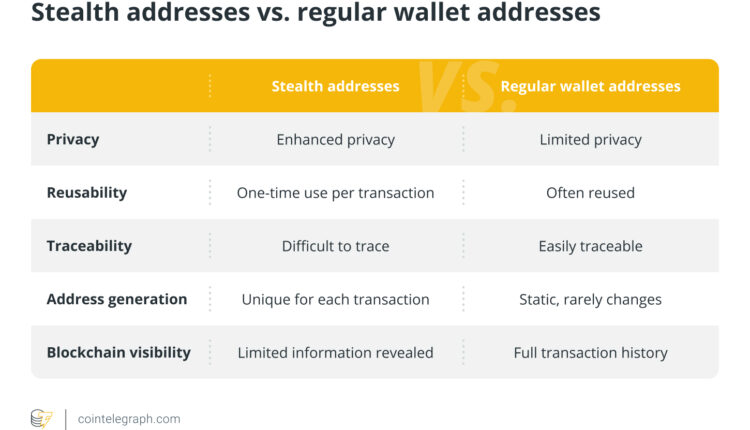 Crypto stealth addresses are a privacy-enhancing feature in blockchain technology that lets users receive money anonymously. Unlike conventional public addresses, stealth addresses provide distinct, one-time addresses for every transaction. The recipient’s actual address is kept secret when a sender transfers funds using a stealth address; the transaction is broadcast to the network.
