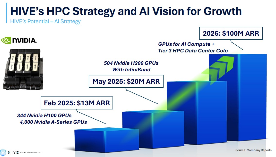 For its 2025 fiscal year, Hive generated $115.3 million in revenue, with $10.1 million — triple the prior year — from AI and HPC hosting. That now makes up nearly 9% of total revenue.