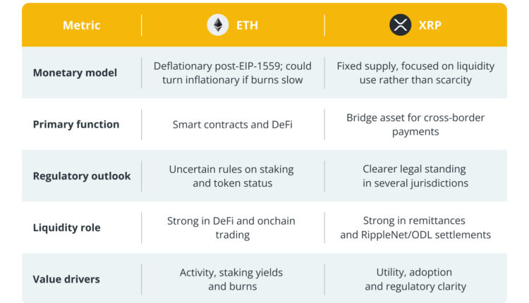 While ETH’s value is largely driven by deflation and staking rewards, XRP’s long-term stability depends on its transaction utility and institutional adoption. Key liquidity indicators highlight XRP’s strength in settlement speed, transaction costs and energy efficiency, while Ethereum maintains a broader ecosystem and higher onchain activity.
