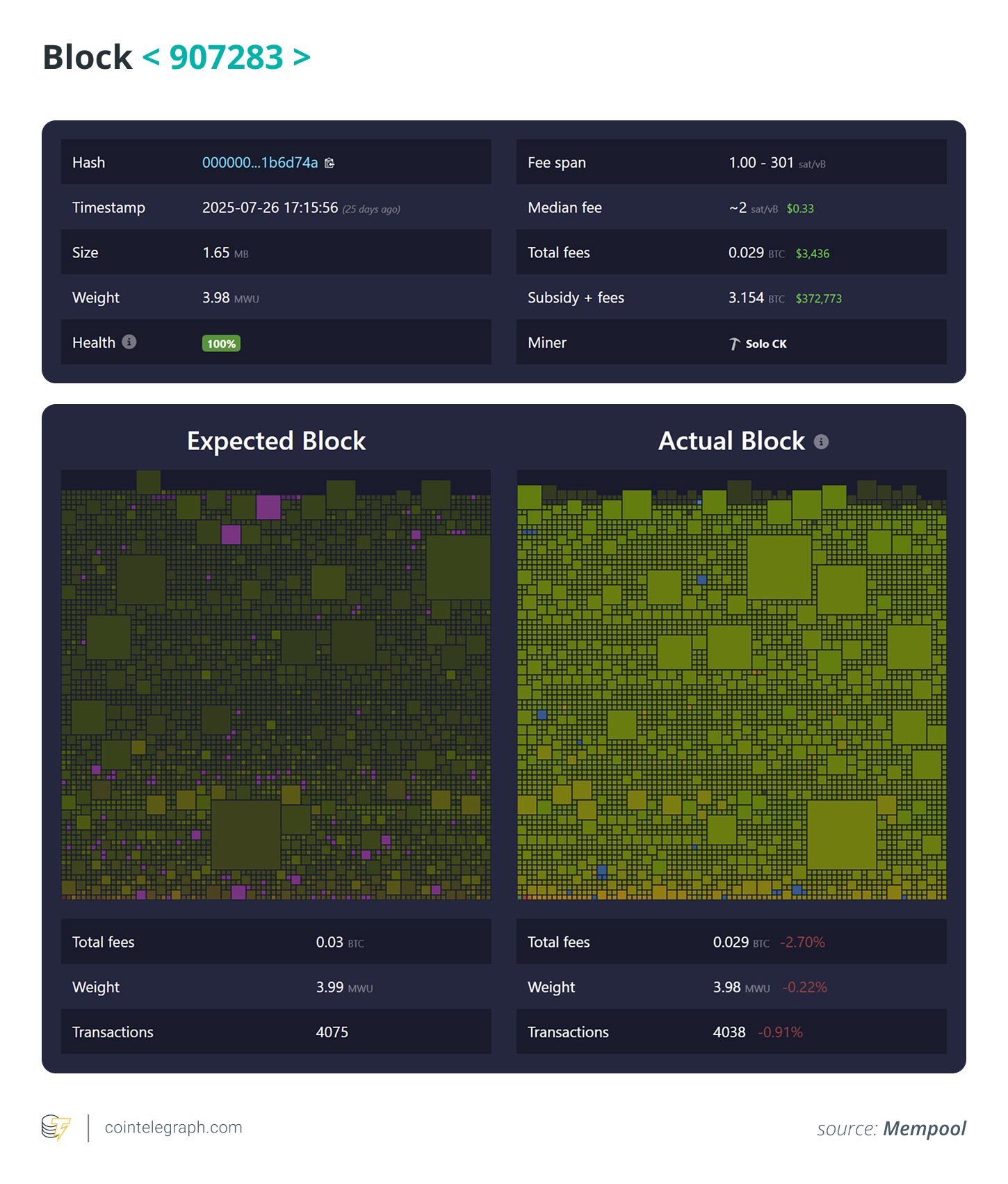 On July 26, 2025, a solo Bitcoin miner achieved an ultra-rare feat by mining block 907,283 through the Solo CKPool.