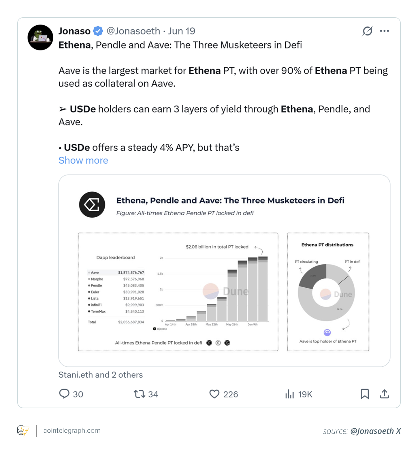 Based on the above X search filter for trending stablecoin content, this tweet surfaced showing that Ethena’s USDe was gaining traction across Aave and Pendle (see image below), with over $2 billion in PT (Principal Token) locked. It highlights how USDe holders can stack multiple yield layers, offering valuable alpha for DeFi-focused traders.