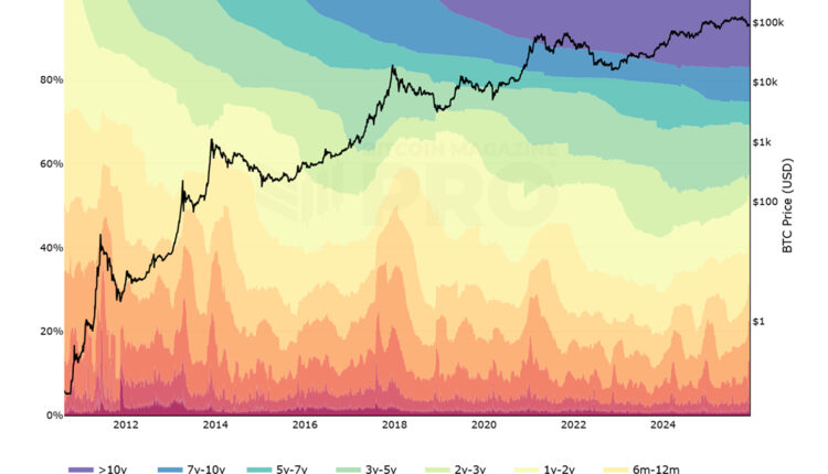 Glassnode’s long-term holder supply, which tracks coins held for around five months or more, hit record highs in late 2024 and then began to roll over into 2025.