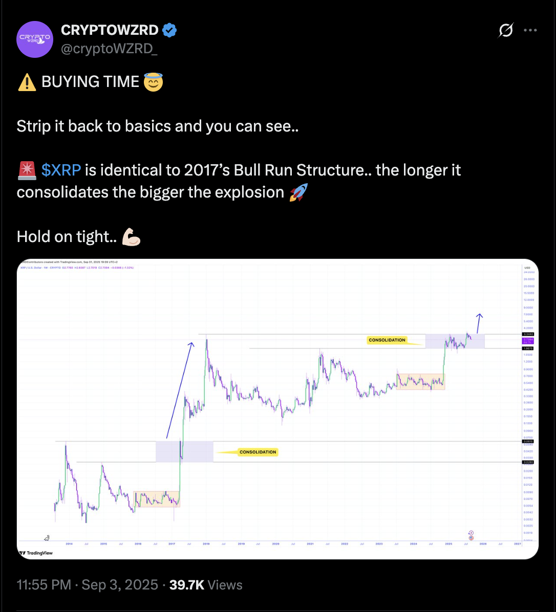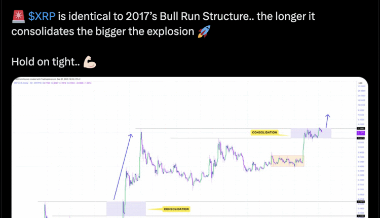 Chartists say today’s consolidation phase is showing the same pattern, anticipating XRP to reach a cycle target of $20.