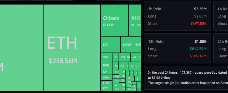 According to data from crypto analytics platform Coinglass, more than $427 million in Bitcoin long positions were liquidated in the last 4 hours. Over the course of the last 24 hours, there were more than more than $822 million liquidations for traders with open long positions — a bet that the price of crypto assets will move upwards.