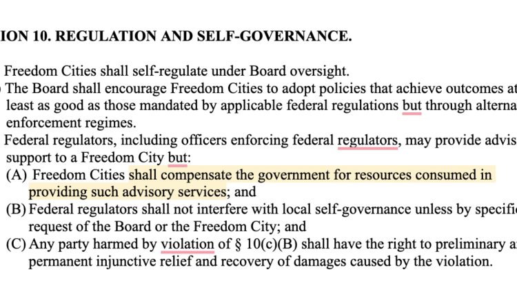 Again, this does not mean that “anything goes.” But it’s not hard to imagine a tax and regulatory regime at work in the jurisdiction of the freedom city that is favorable to corporate interests, said Woodworth. “Indeed, the impetus for freedom cities seems to be precisely to create exceptional conditions that make an end run around the regulatory thicket that frustrates a lot of people, including in the crypto business.”