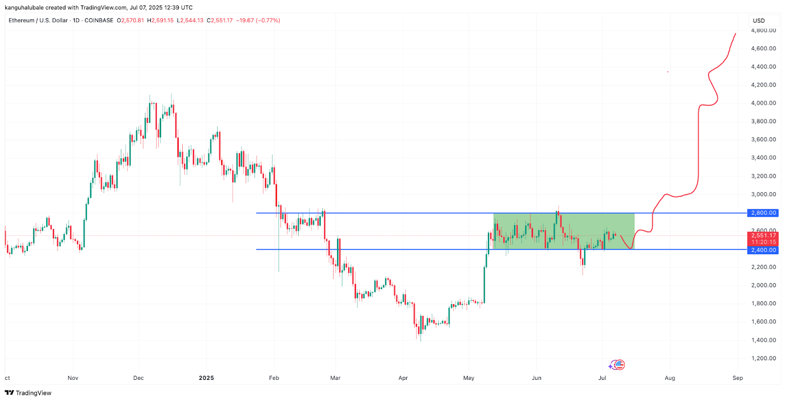 Higher than that, the next logical move would be toward the 2021 all-time highs of $4,800, representing a 92% increase from the current price.