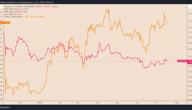 On July 18, DOGE price fell 1.75% to $0.068, slightly underperforming the rest of the crypto market that dropped 1% in the same period.