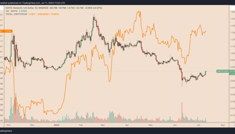 On July 11, the MATIC price rose 2.32% to $0.75, its highest level in a month — outperforming the crypto market, whose valuation stayed relatively unchanged from the previous day at around $1.14 trillion.