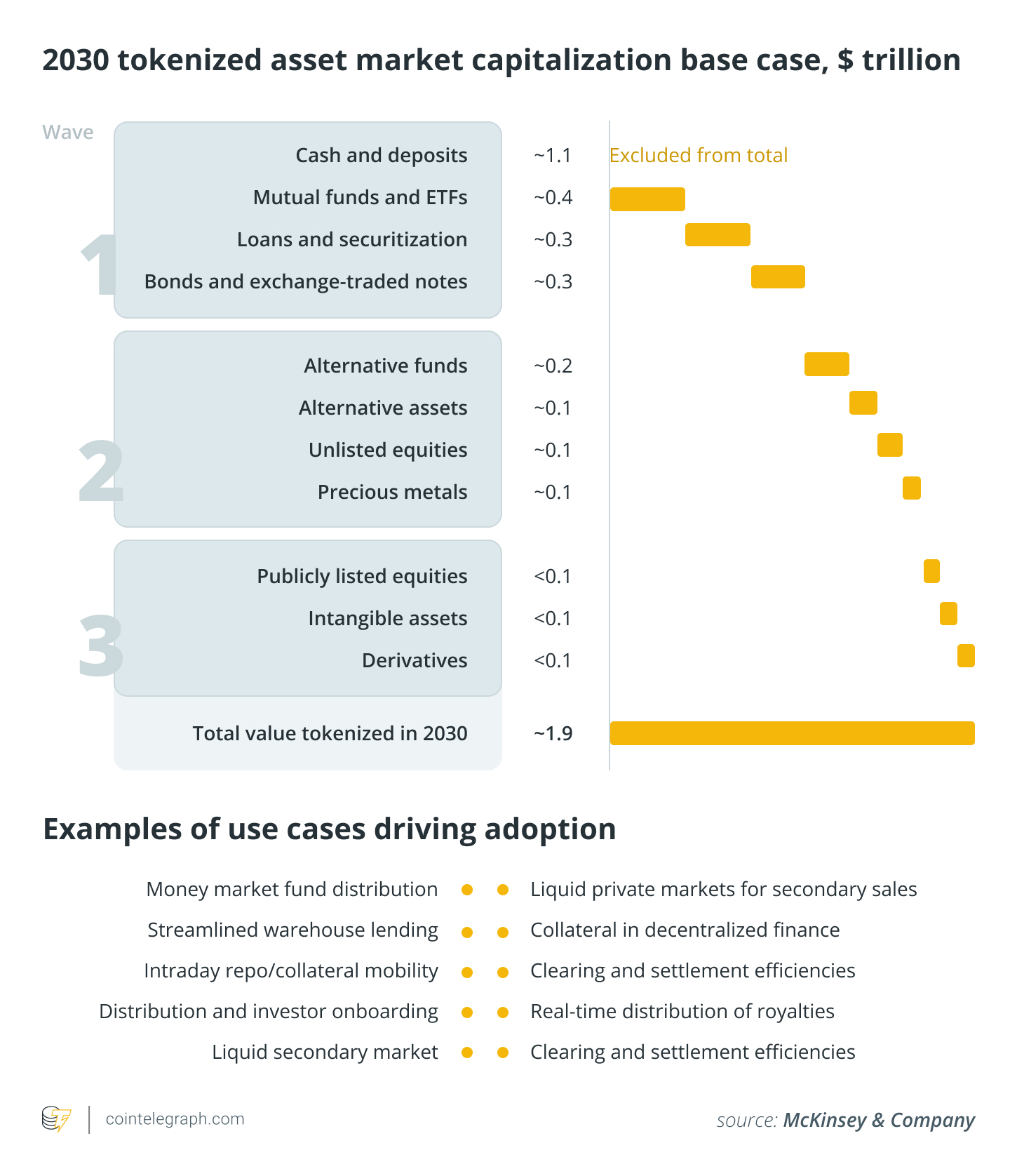 McKinsey’s base case estimates tokenized financial assets at around $2 trillion by 2030, excluding crypto and stablecoins.