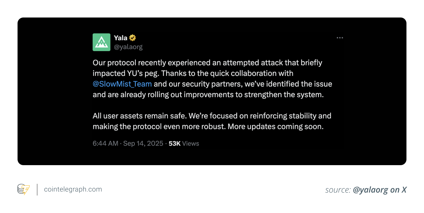 The Yala team stated that all Bitcoin (BTC) collateral was safe, but YU still failed to regain its peg. They disabled the Convert and Bridge functions and began an investigation with security partners.