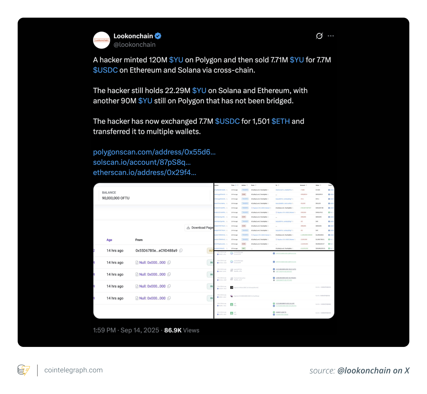 By Sept. 14, 2025, the attacker had converted the USDC into 1,501 ETH and distributed the funds among multiple wallets. According to Lookonchain, the attacker still held 22.29 million YU tokens on Ethereum and Solana, with an additional 90 million YU remaining on the Polygon network, which had not been bridged.