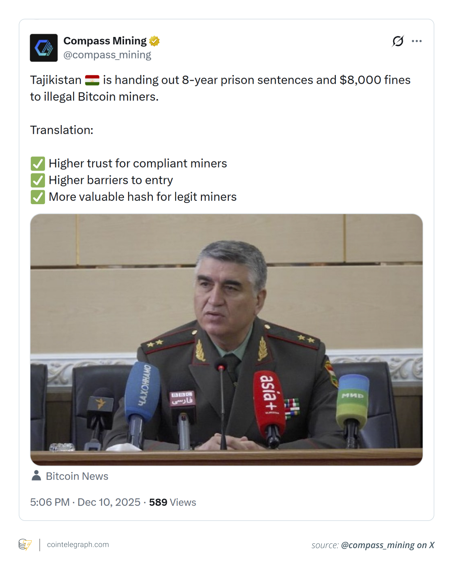 • Tajikistan has criminalized the use of stolen electricity for cryptocurrency mining, introducing fines of up to $8,250 and prison sentences of up to eight years.