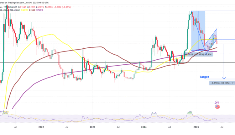 Dogecoin’s (DOGE) price flipped bearish on June 5 after a public feud broke out between US President Donald Trump and its most celebrated backer, Elon Musk. DOGE price is down 7% over the last 24 hours to $0.17, with a classic bearish pattern projecting further losses to $0.06.