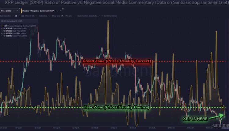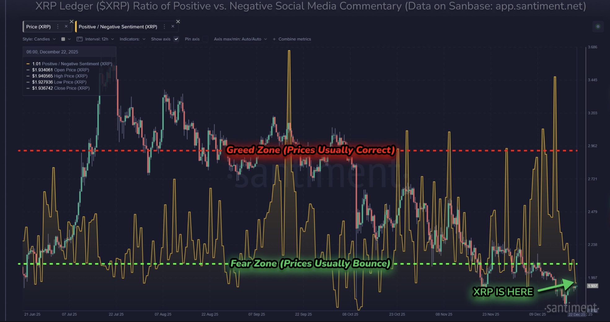 Social sentiment toward XRP has plunged into the “fear zone,” levels that have historically preceded strong rallies.