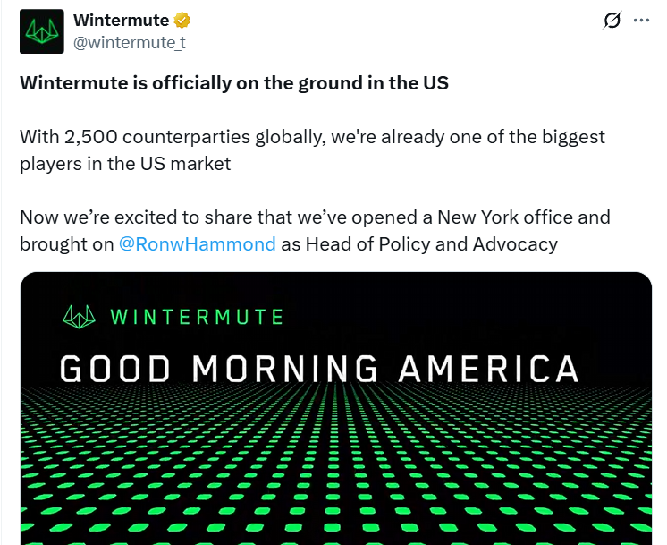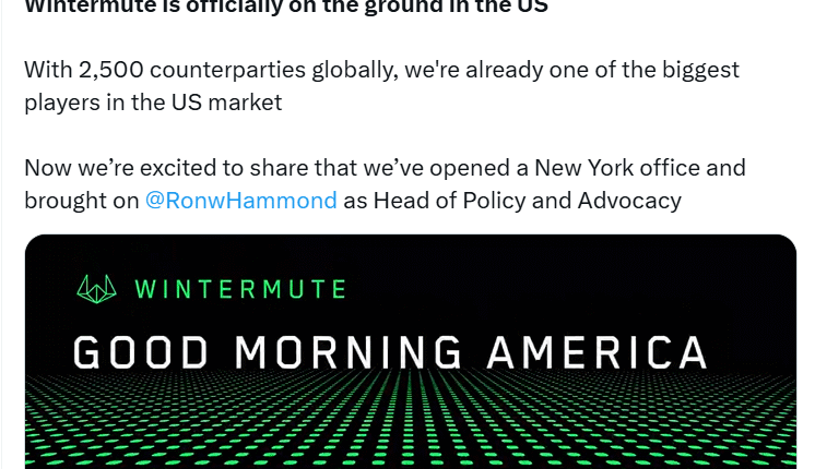 Wintermute announced the opening of its New York office on May 15, citing improved regulatory conditions in the world’s largest economy.