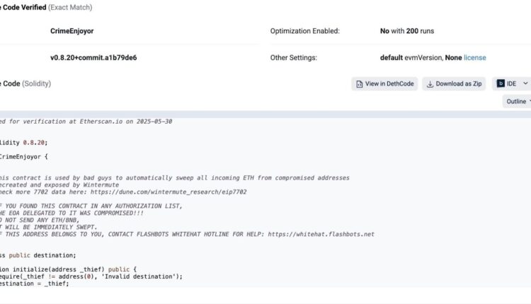 Wintermute’s code, dubbed “CrimeEnjoyor,” prints a warning within malicious Ethereum contracts that are “designed to auto-sweep funds” from wallets with leaked private keys, it said in a May 30 X post.