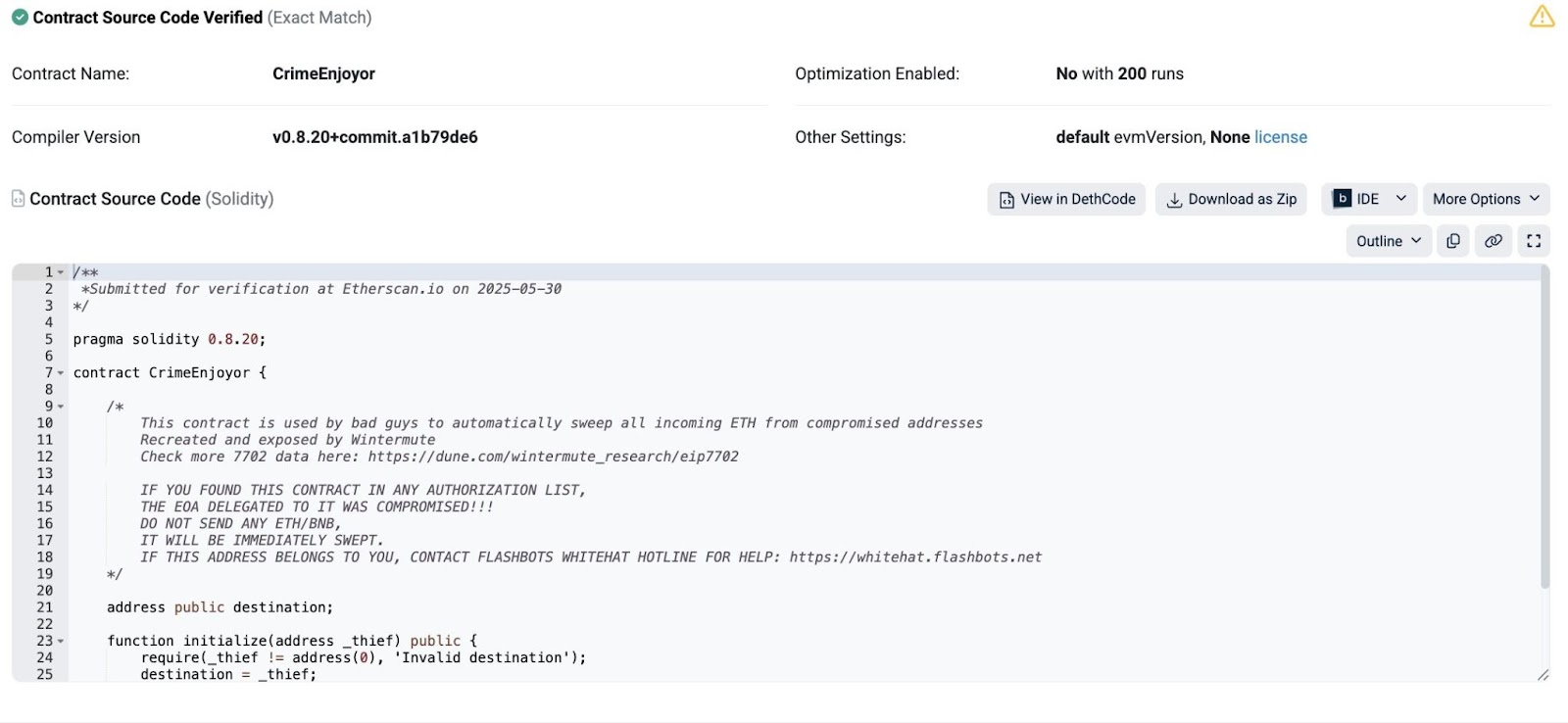 Wintermute said it to make the CrimeEnjoyor code show up in the malicious contracts, it reversed their Ethereum Virtual Machine bytecode into human-readable Solidity code and publicly verified it.
