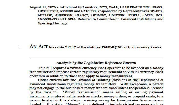 Lawmakers in the US state of Wisconsin introduced a bill in the state’s Senate to accompany an earlier bill filed in the lower house that aims to curb fraud occurring through crypto ATMs.