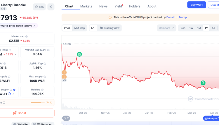 WLFI token down 65% over the past year. Source: CoinMarketCap