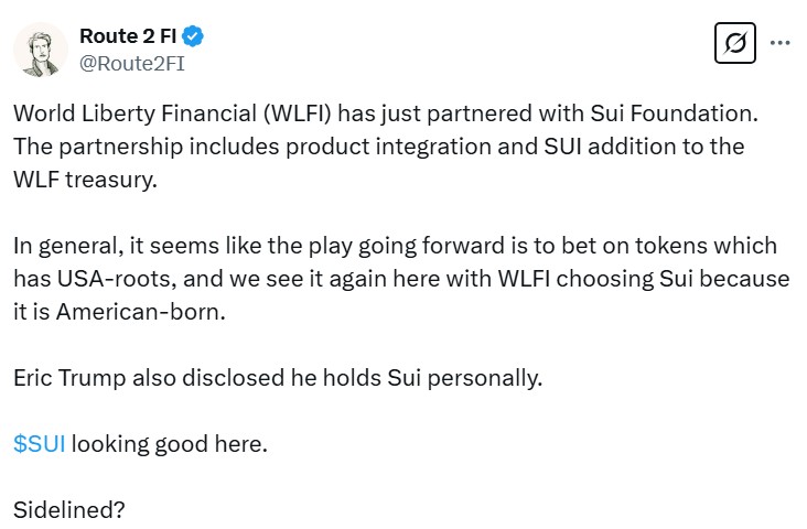 Sui’s inclusion in WLFI’s reserve is not entirely unexpected, as Eric Trump, the president’s son, has publicly expressed support for and personally holds the cryptocurrency.