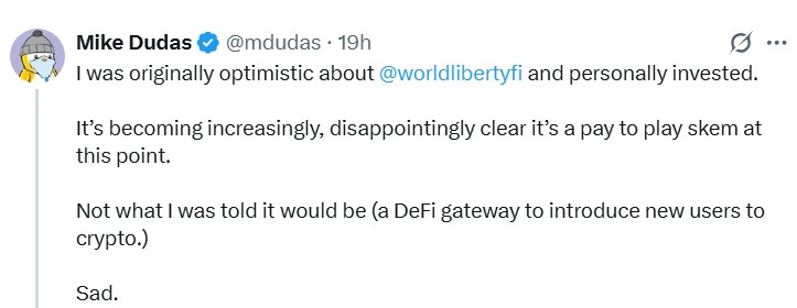 Mike Dudas, managing partner at crypto venture fund 6MV and a self-identified WLFI investor, dismissed the project as a “pay-to-play” scheme.
