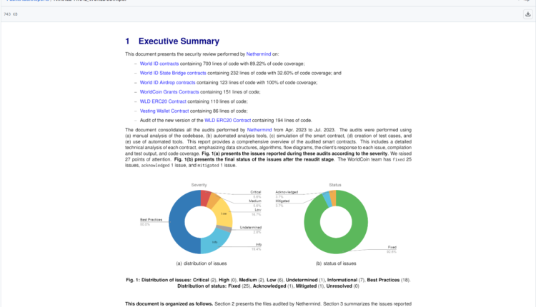 According to an accompanying announcement from Worldcoin, Nethermind found 26 security issues with the protocol, of which 24 were “identified as fixed” during the verification phase while one was mitigated and another was acknowledged.