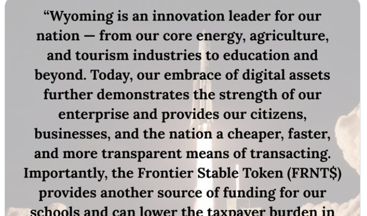 The state’s Governor Mark Gordon said on Wednesday that it is “the first fiat-backed, fully-reserved stable token to be issued by a public entity in the United States.”