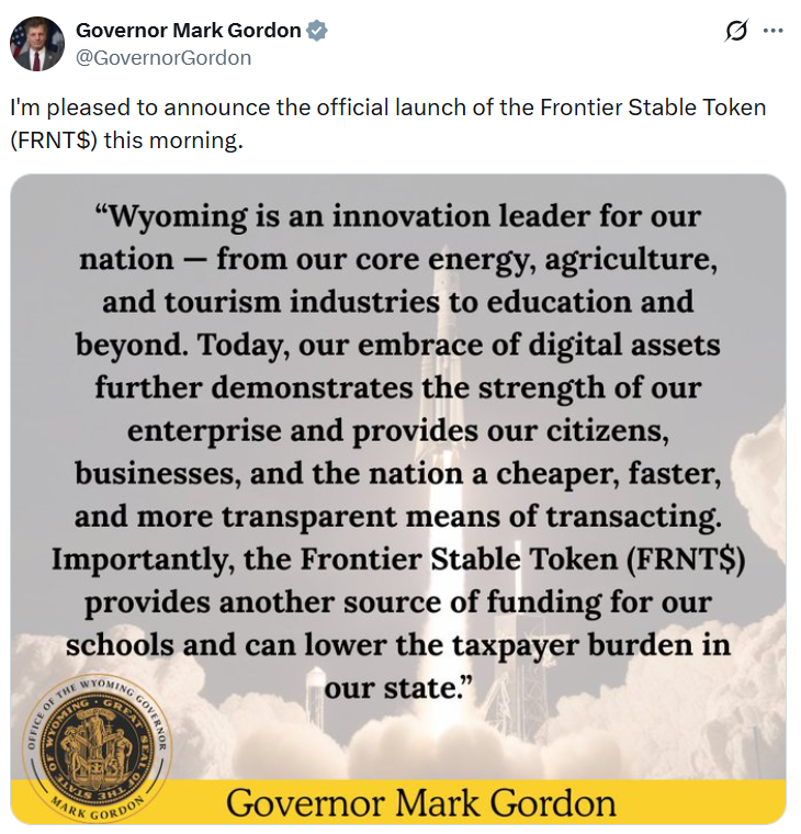 Wyoming State-Backed Stablecoin FRNT Goes Live to Public