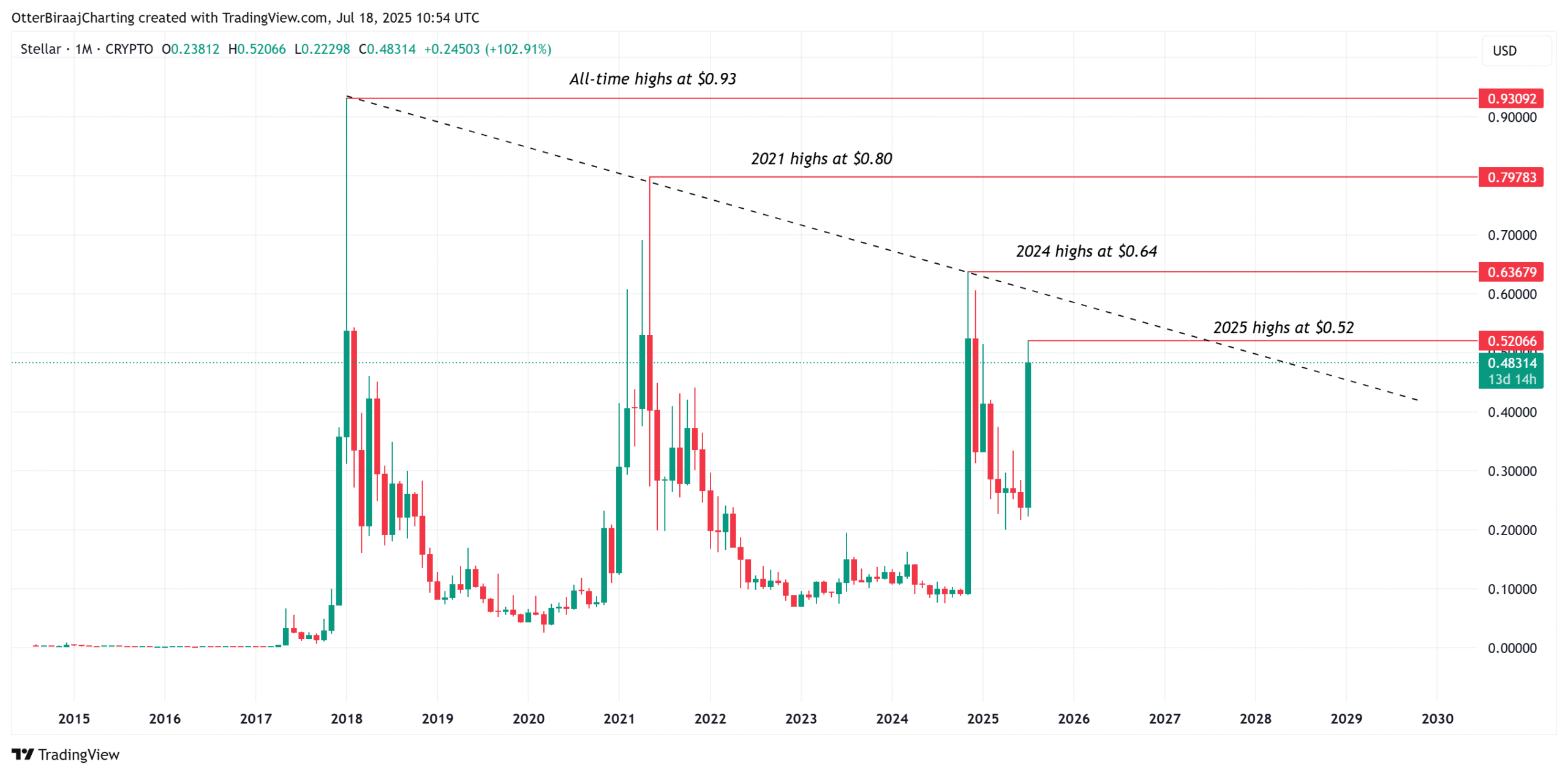 XLM hit a yearly high of $0.52, with immediate targets set on cycle highs at $0.63.