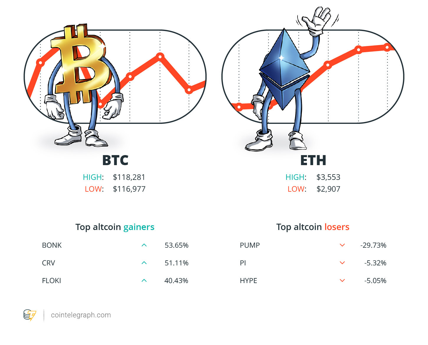 The top three altcoin losers of the week are Pump.fun (PUMP) at 29.73%, Pi (PI) at 5.32% and Hyperliquid (HYPE) at 5.05%. For more info on crypto prices, make sure to read Cointelegraph’s market analysis.
