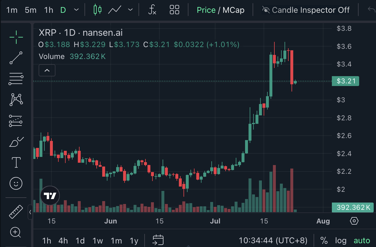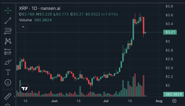XRP is trading at $3.21 at the time of publication, down 10.20% over the past 24 hours, according to Nansen.